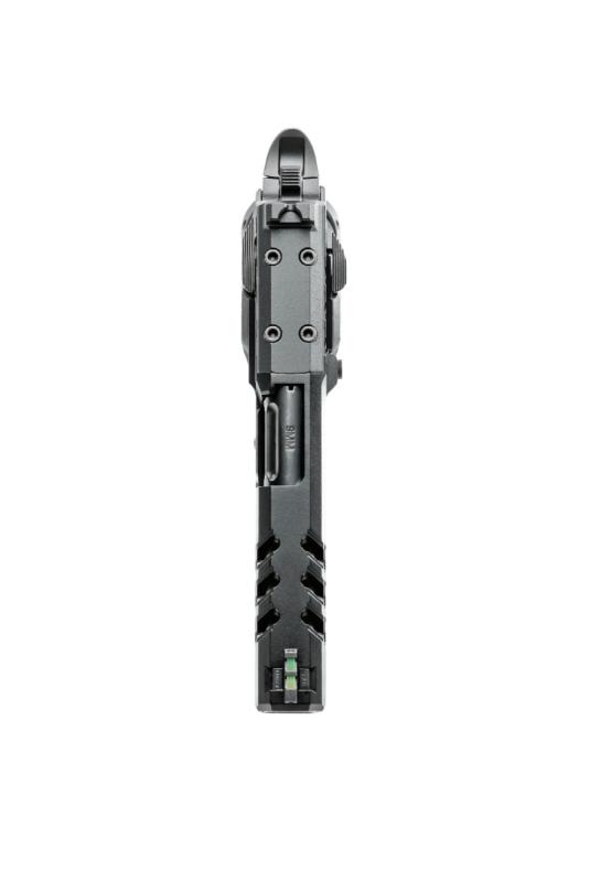 The 4.25" (108 mm) stainless steel barrel is fluted, ramped, finished in Black DLC, and utilizes 5R rifling with a 1:10 twist rate (left hand). The crowned barrel enhances precision. Sight radius is 6.8" (≈ 17.27 cm).