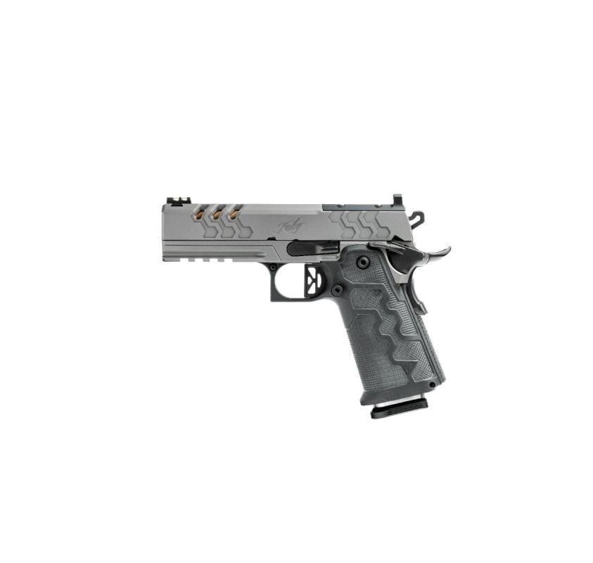 The pistol is built on a Stainless Steel frame paired with an SST steel sub-frame finished in matte KimPro Granite. A tapered magwell enhances reload efficiency, and an ambidextrous safety ensures intuitive operation. Frame width measures 1.53" (≈ 3.89 cm).