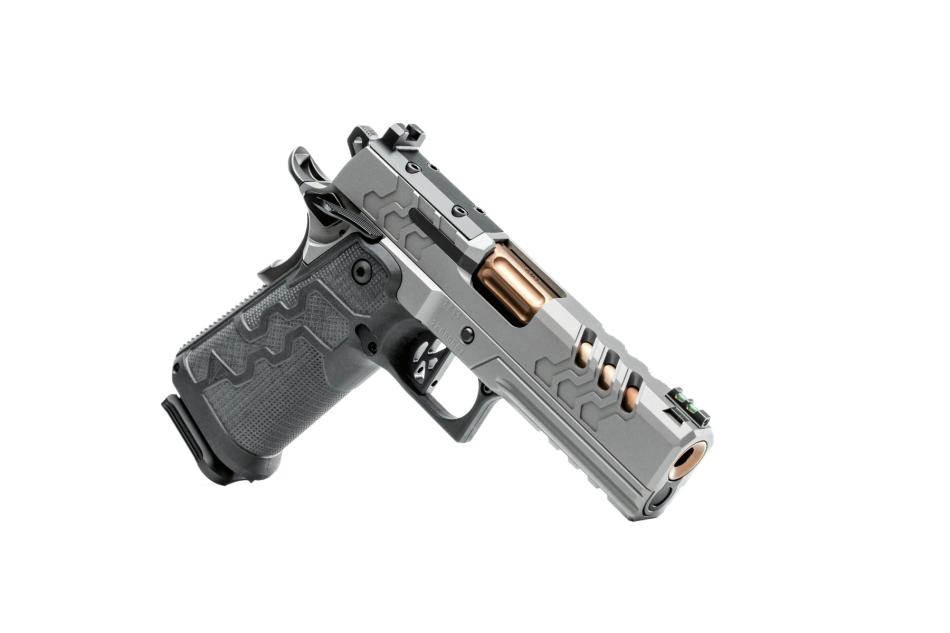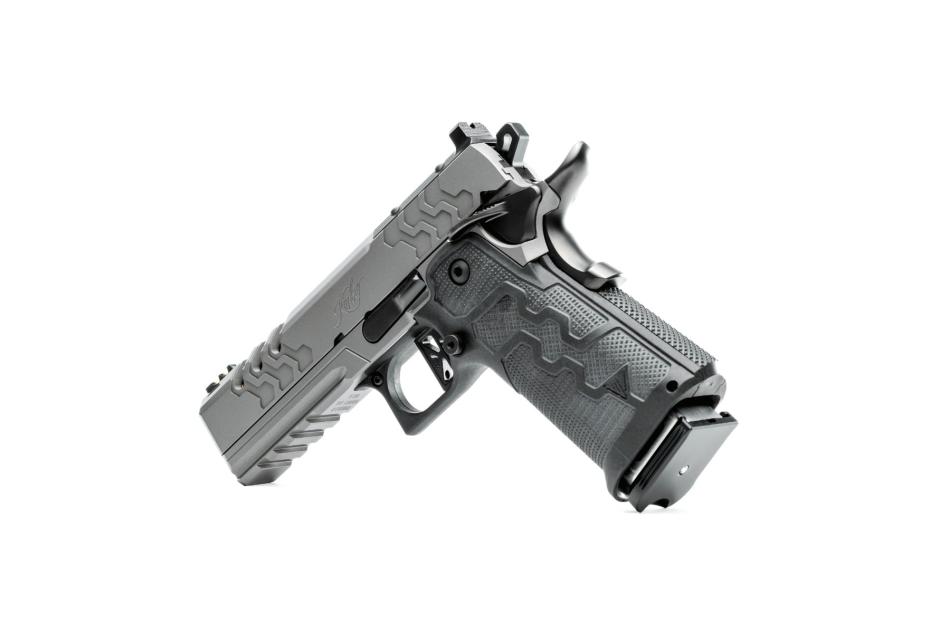 The aluminum GT Match Grade Trigger delivers a clean break between 3–4 lb (≈ 13.3–17.8 N), with short travel and zero creep. The pistol incorporates a Tool-less Guide Rod (patent-pending) and a recoil spring rated at 12 lb (≈ 53.4 N).