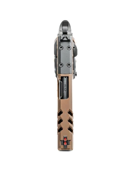 Závěr z nerezové oceli s externím vytahovačem je opatřen povrchovou úpravou Coyote PVD a obsahuje optimalizovanou rampu odpojovače (disconnector ramp) pro hladší chod mechanismu. Integrovaná montážní lišta umožňuje instalaci svítilny nebo laserového zaměřovače.